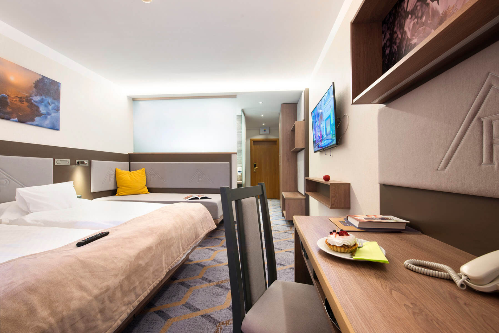 We have chosen the hotel because of its location near the lake and in the center of High Tatras. It has its own parking place, ski service, wellness and outside restaurant called Koliba near the lake. We had room on the first floor with view to the mountains which was beautiful. It very good located for walking and skiing. The room was very nice and clean with all equipment you need on vacation or business trip. Sad thing for me was two small trash bins in the room (one for one bottle of orange juice) and very bad wifi connection in the room. For me it was unusable during the whole stay there. The meals and staff are great and you may compare it to five star summer hotels near sea. The wellness is good but too much crowded during our stay there. If I will visit High Tatras I will choose this hotel again. And you may take your dog with you for 25 EUR per day.